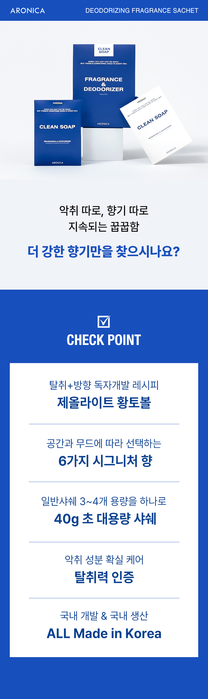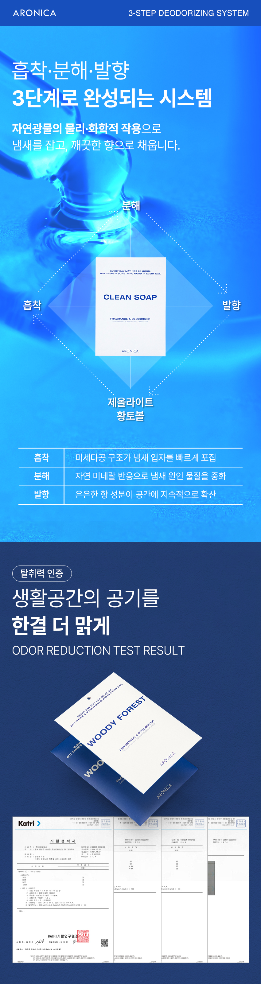 | 제품에 사용된 화학물질 명칭 | 클린솝 - 주요물질:제올라이트, 향료(다이프로필렌글라이콜 등), 황토, 알레르기물질:부틸페닐메칠프로피오날, 기타물질:리모넨, 그 외 상세페이지 하단 참조 | ||